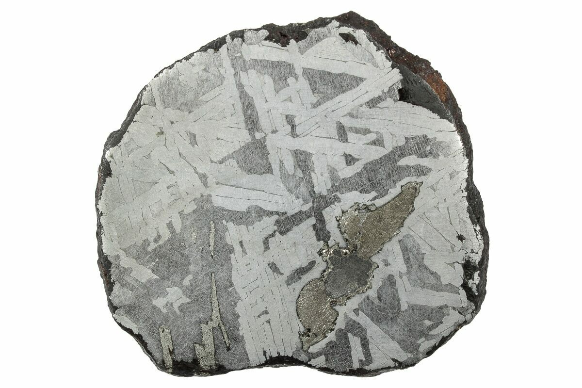 This is a gorgeous, 2.48" wide (61.78 gram) etched slice of the Toluca iron meteorite from Mexico. It shows very nice Widmanstätten patterns on the cut and polished face.