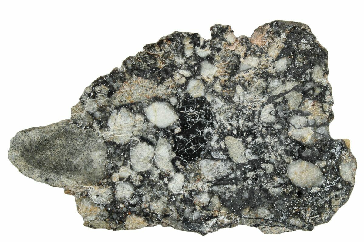 This is an incredible, 2.57" wide (6.65 gram), thin slice of the lunar meteorite Ajdabiya 001, found in 2021. The meteorite has been polished to a glossy finish on one side to highlight the alluring clasts.