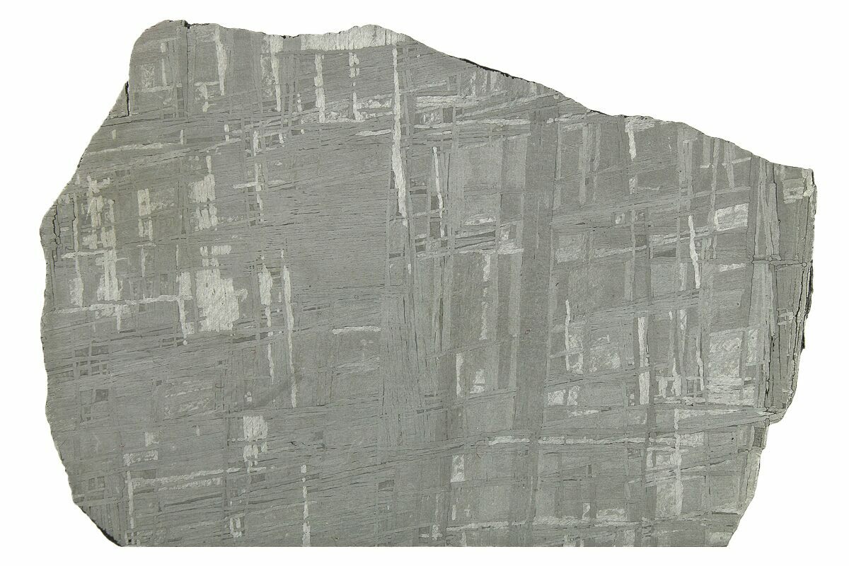Most iron meteorites have distinctive, geometric patterns called Widmanstätten patterns, which become visible when the meteorite is cut and acid etched. These patterns are criss-crossing bands of the iron-nickel alloys kamacite and taenite that slowly crystalized as the core of the meteorites' parent bodies slowly cooled. Such large alloy crystallizations for mover millions of years and do not occur naturally on Earth, further proving that iron meteorites come from extraterrestrial bodies.