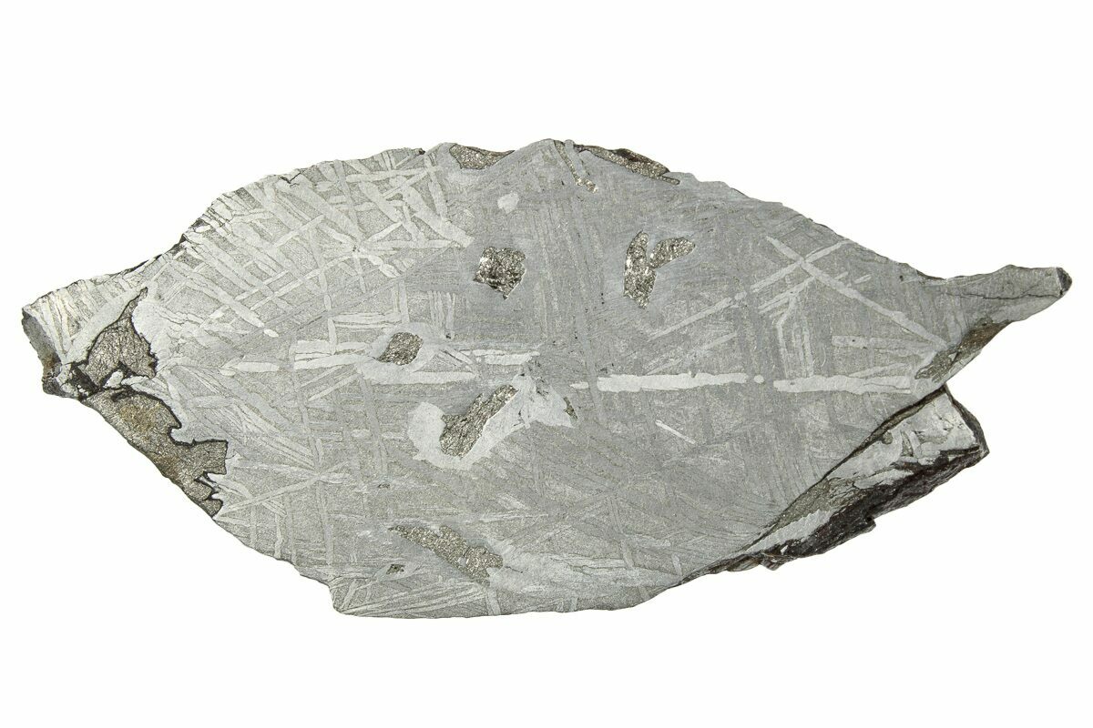 This is a 2.79" wide (32.02 grams) piece of the Saint-Aubin iron meteorite from Aube, France. It has been nicely cut into a thin slice and etched to display the complex Widmanstätten pattern.