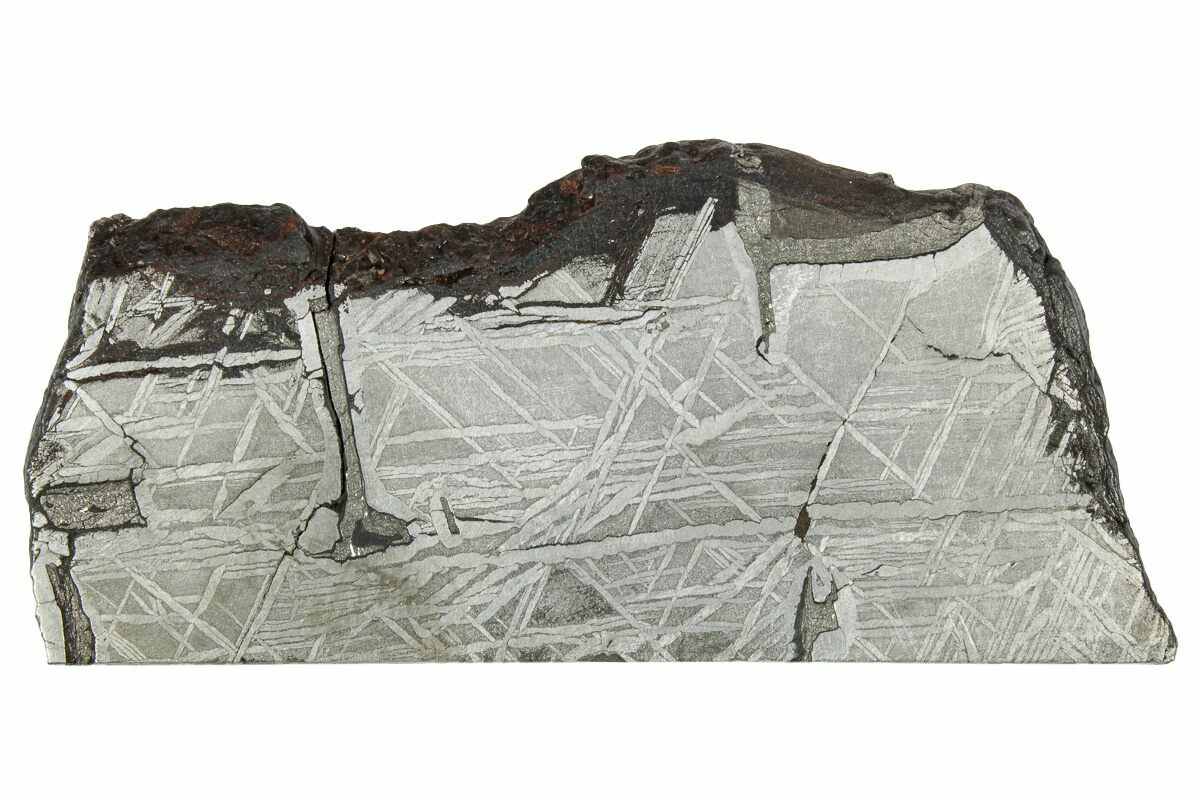 This is a 2.82" wide (39.39 grams) piece of the Saint-Aubin iron meteorite from Aube, France. It has been nicely cut into a thin slice and etched to display the complex Widmanstätten pattern.