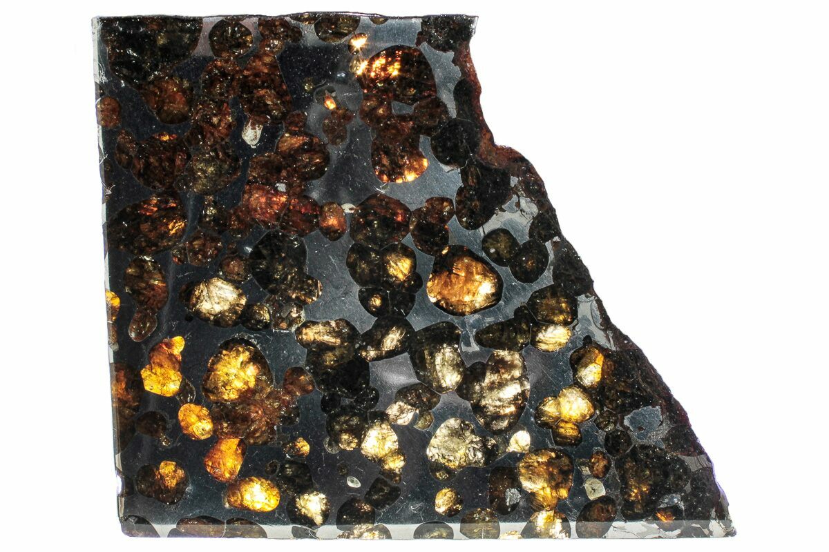 This is a 3.11" wide (59.60 grams) sliced piece of a Sericho pallasite meteorite. This spectacular meteorite has been fully stabilized and coated to prevent rusting. It is cut thin enough that it is translucent and the peridot crystals glow when backlit.