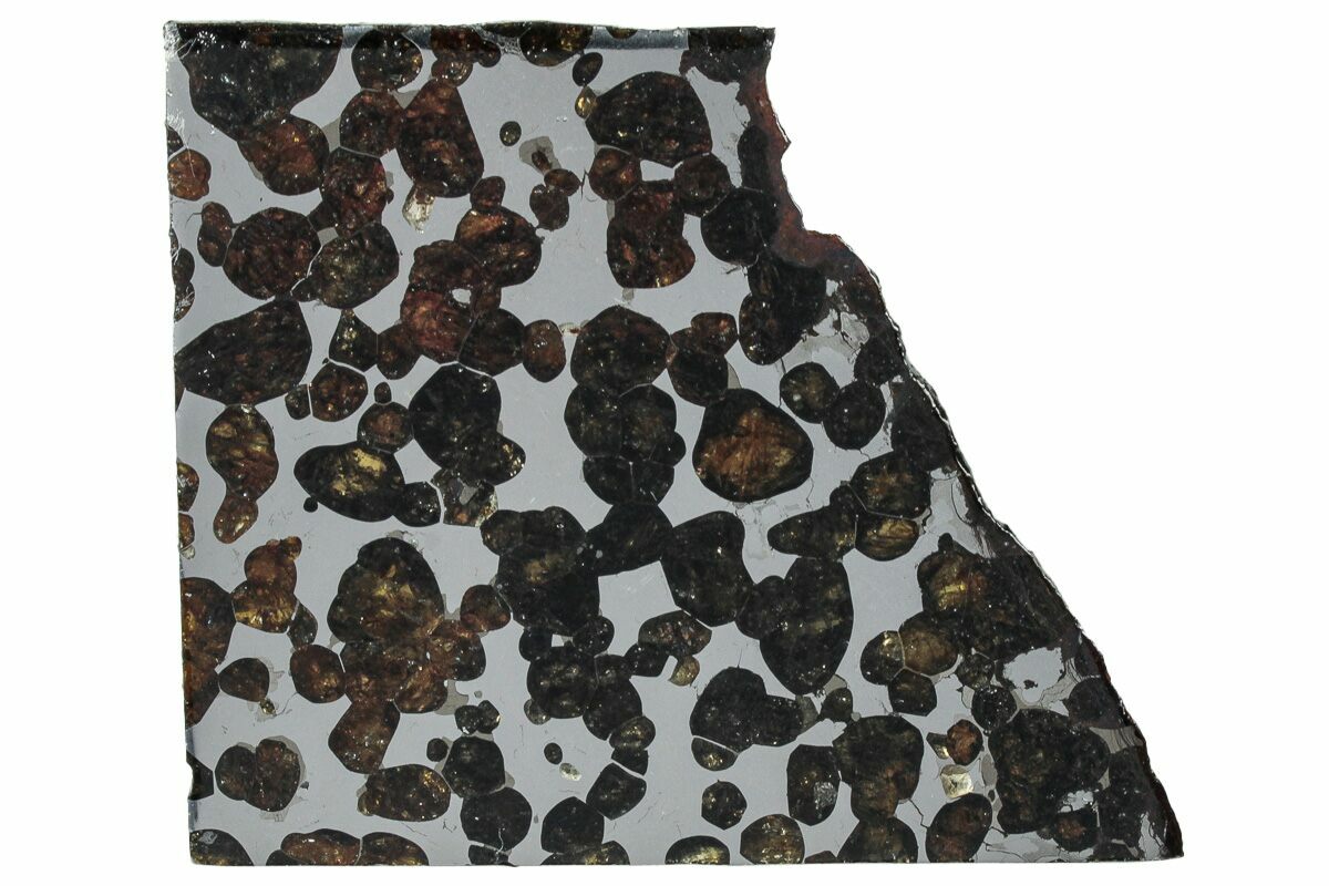 Sericho pallasite has rounded, gemmy olivine crystals varying in color from green to orange. Often its metal-rich areas show well-developed Widmanstätten patterns. They also have a particularly high olivine crystal density, as high as 70-80% in many specimens. It is quite attractive, particularly when sliced thin so light can pass through the olivine pockets: this makes it popular among collectors.