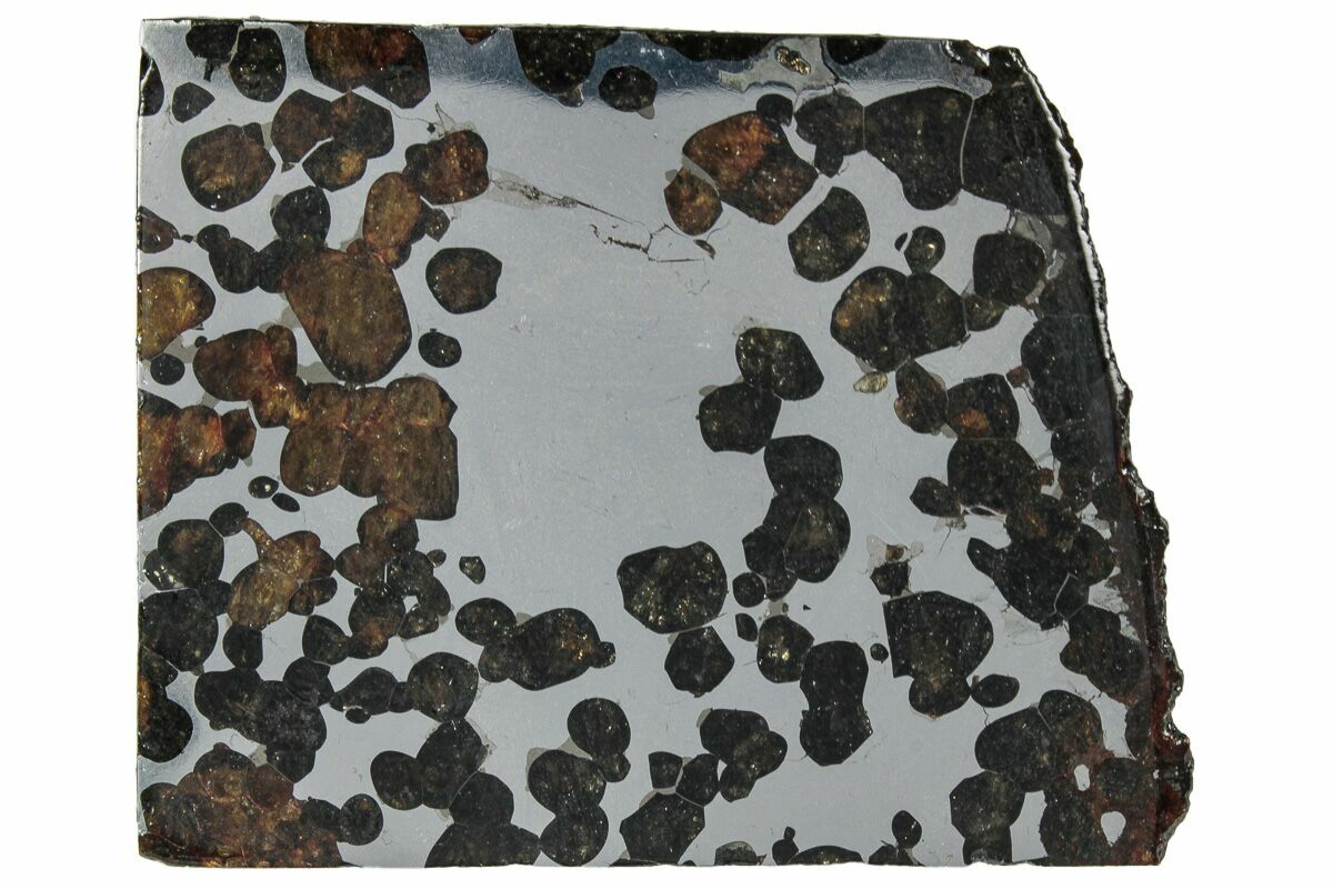 Sericho pallasite has rounded, gemmy olivine crystals varying in color from green to orange. Often its metal-rich areas show well-developed Widmanstätten patterns. They also have a particularly high olivine crystal density, as high as 70-80% in many specimens. It is quite attractive, particularly when sliced thin so light can pass through the olivine pockets: this makes it popular among collectors.