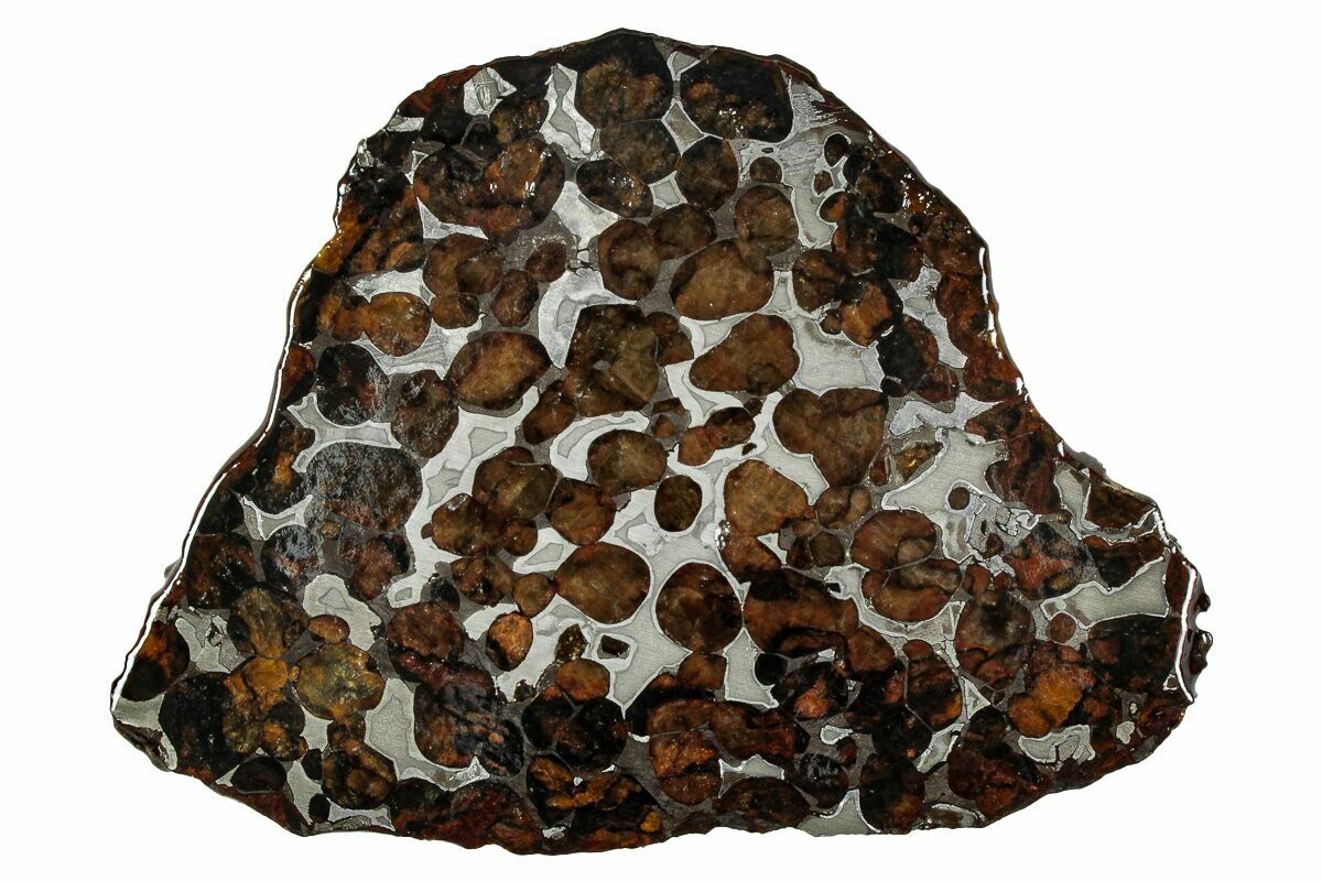 Sericho pallasite has rounded, gemmy olivine crystals varying in color from green to orange. Often its metal-rich areas show well-developed Widmanstätten patterns. They also have a particularly high olivine crystal density, as high as 70-80% in many specimens. It is quite attractive, particularly when sliced thin so light can pass through the olivine pockets: this makes it popular among collectors.