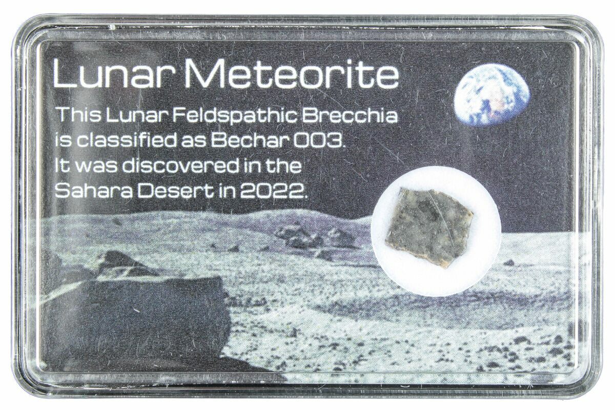 This is a .31" wide (0.11 grams) slice of the lunar meteorite Bechar 003, found in 2022 in Algeria. It has been nicely cut into a thin slice and polished to a glossy finish. It comes in the pictured display case.