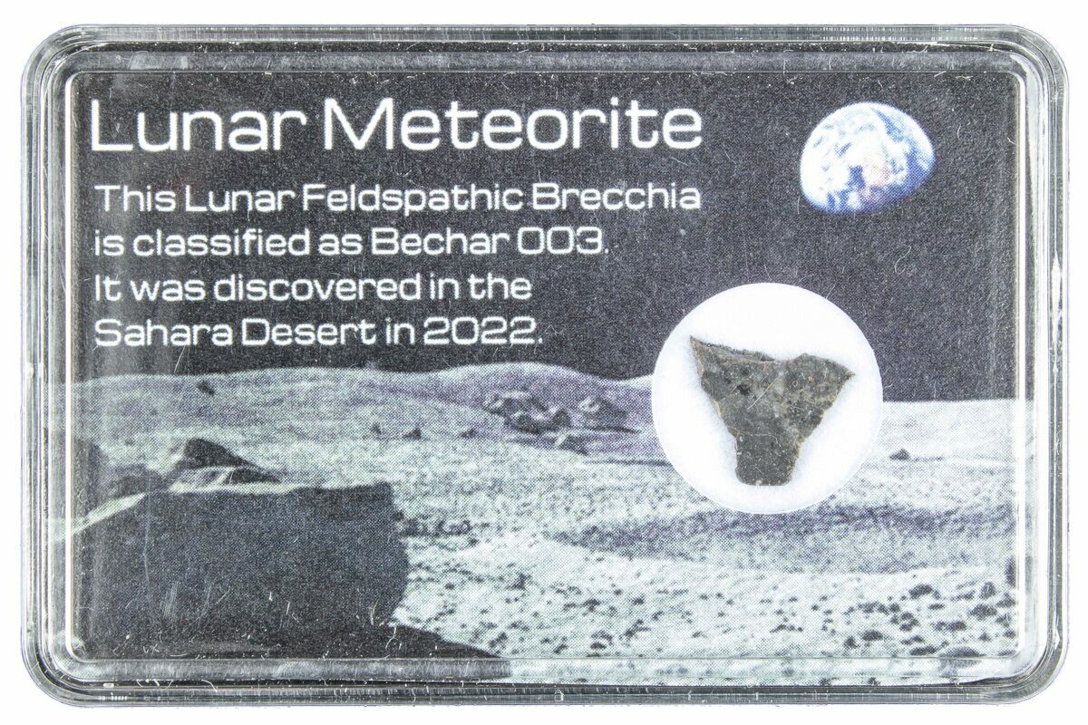 This is a .36" wide (0.11 grams) slice of the lunar meteorite Bechar 003, found in 2022 in Algeria. It has been nicely cut into a thin slice and polished to a glossy finish. It comes in the pictured display case.