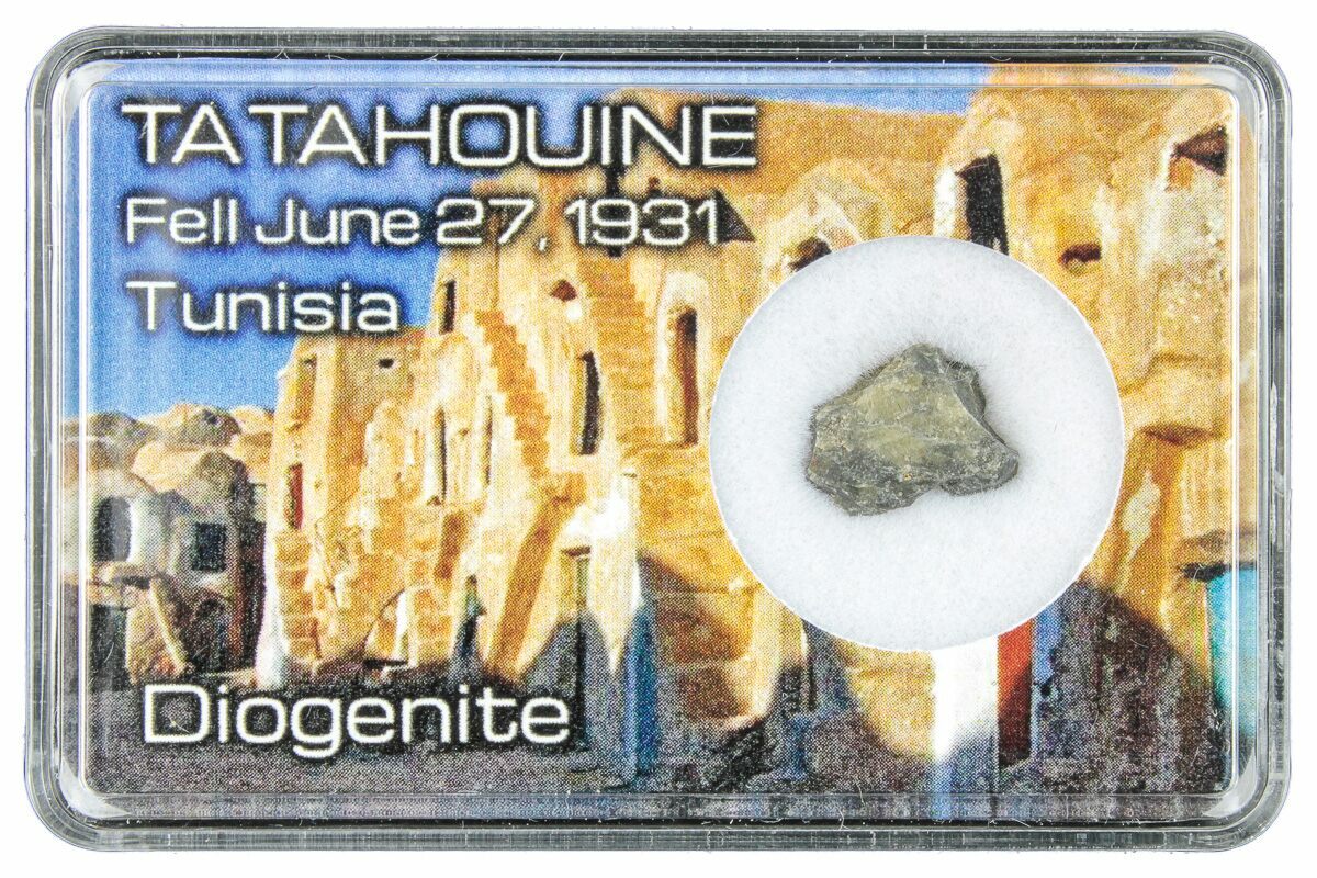This is a .39" wide fragment of the diogenite meteorite known as Tatahouine, an observed fall that landed in the desert near the city of Tatahouine (Tataouine), Tunisia on June 27, 1931. And yes, it shares its name with Luke Skywalker's home planet!