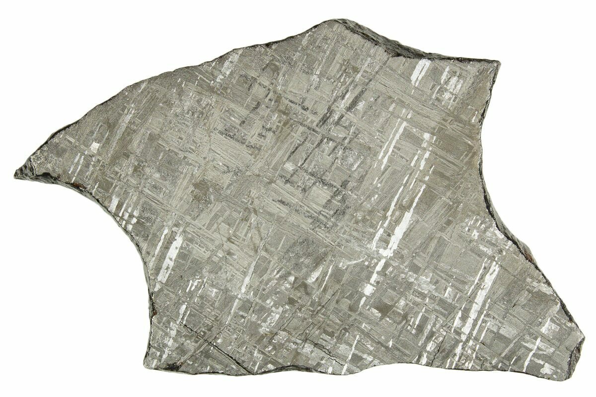 Most iron meteorites have distinctive, geometric patterns called Widmanstätten patterns, which become visible when the meteorite is cut and acid etched. These patterns are criss-crossing bands of the iron-nickel alloys kamacite and taenite that slowly crystalized as the core of the meteorites' parent bodies slowly cooled. Such large alloy crystallizations for mover millions of years and do not occur naturally on Earth, further proving that iron meteorites come from extraterrestrial bodies.