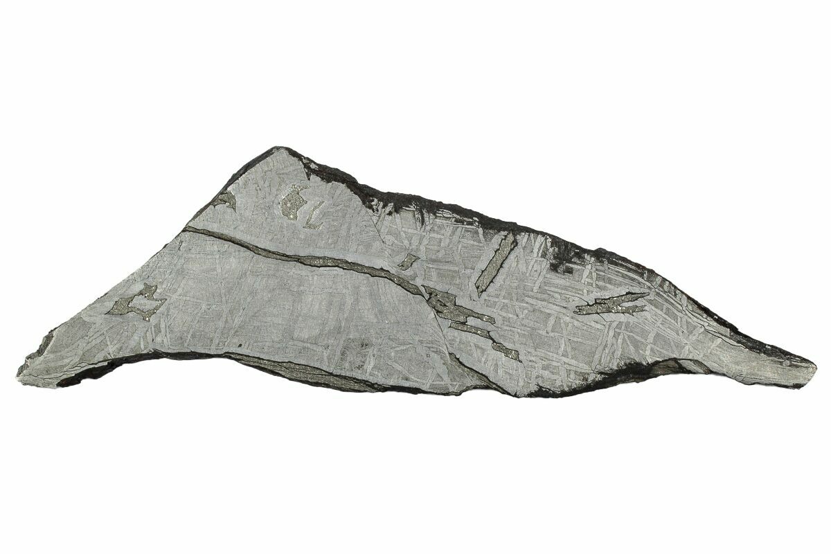 This is a 4.31" wide (37.44 grams) piece of the Saint-Aubin iron meteorite from Aube, France. It has been nicely cut into a thin slice and etched to display the complex Widmanstätten pattern.