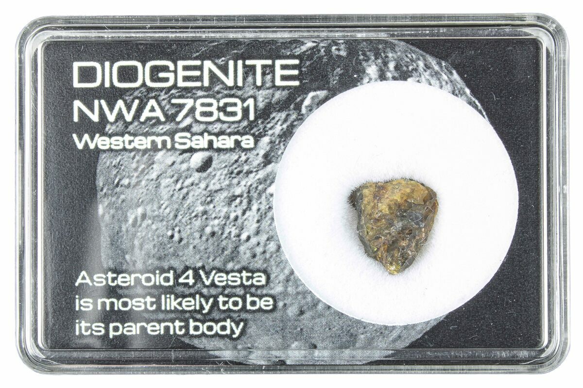 This is a .41" wide (.91 gram) fragment of the Diogenite meteorite NWA 7831 in an acrylic display case. It has beautiful, gemmy, green orthopyroxene crystals that have a bright sheen on their cleaved faces. A really beautiful and interesting meteorite!