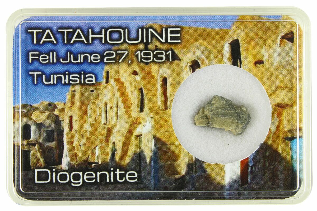 This is a .41" wide fragment of the diogenite meteorite known as Tatahouine, an observed fall that landed in the desert near the city of Tatahouine (Tataouine), Tunisia on June 27, 1931. And yes, it shares its name with Luke Skywalker's home planet!