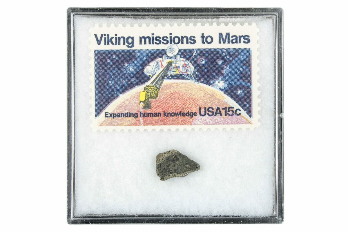 This is a .44" wide (.21 grams) martian meteorite slice from the Amgala 001 fall. This meteorite comes in a custom acrylic case which includes a 1978 Viking Mission to Mars stamp. This 15-cent multicolored commemorative stamp depicts the Viking 1 lander, the landing component, collecting a soil sample on Mars.