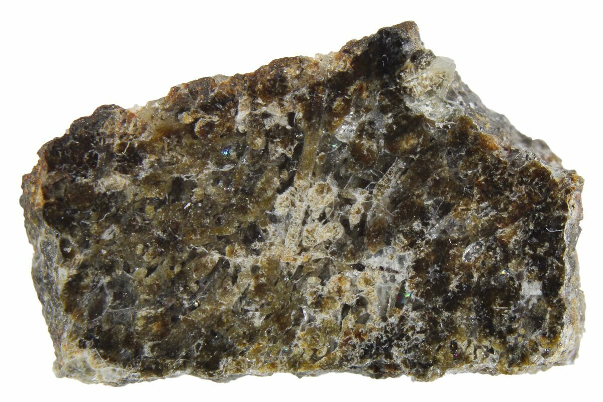 This is a .45" wide (0.41 grams) slice of the martian meteorite NWA (14714). It has been nicely cut into a thin slice and polished to a glossy finish on one side. It even displays some iridescence in translucent pockets throughout which can be seen in the photo above.
