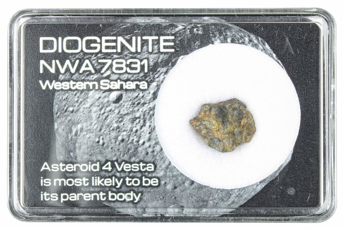 This is a .46" wide (.9 gram) fragment of the Diogenite meteorite NWA 7831 in an acrylic display case. It has beautiful, gemmy, green orthopyroxene crystals that have a bright sheen on their cleaved faces. A really beautiful and interesting meteorite!