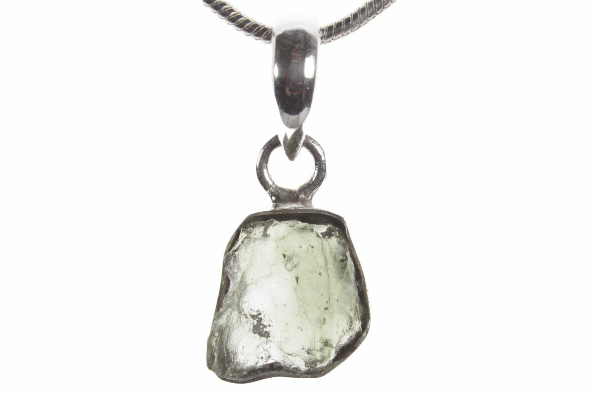 This is an authentic moldavite tektite specimen that was collected in the Czech Republic. The moldavite is inlaid in a silver pendant setting that allows you to take your favorite impactite on the go. When holding a light behind the pendant, the beautiful green coloration and translucency becomes apparent.