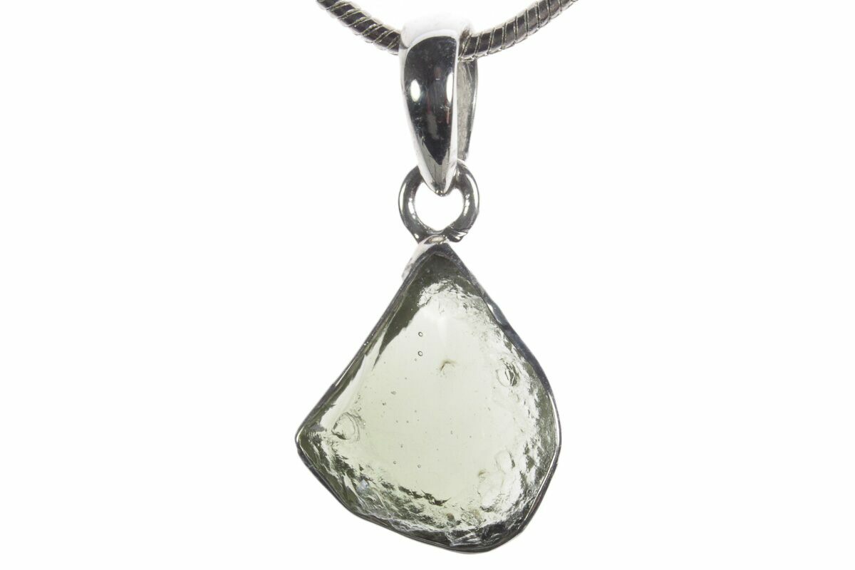 This is an authentic moldavite tektite specimen that was collected in the Czech Republic. The moldavite is inlaid in a silver pendant setting that allows you to take your favorite impactite on the go. When holding a light behind the pendant, the beautiful green coloration and translucency becomes apparent.