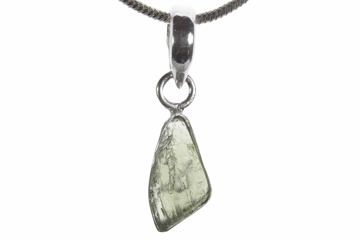 This is an authentic moldavite tektite specimen that was collected in the Czech Republic. The moldavite is inlaid in a silver pendant setting that allows you to take your favorite impactite on the go. When holding a light behind the pendant, the beautiful green coloration and translucency becomes apparent.