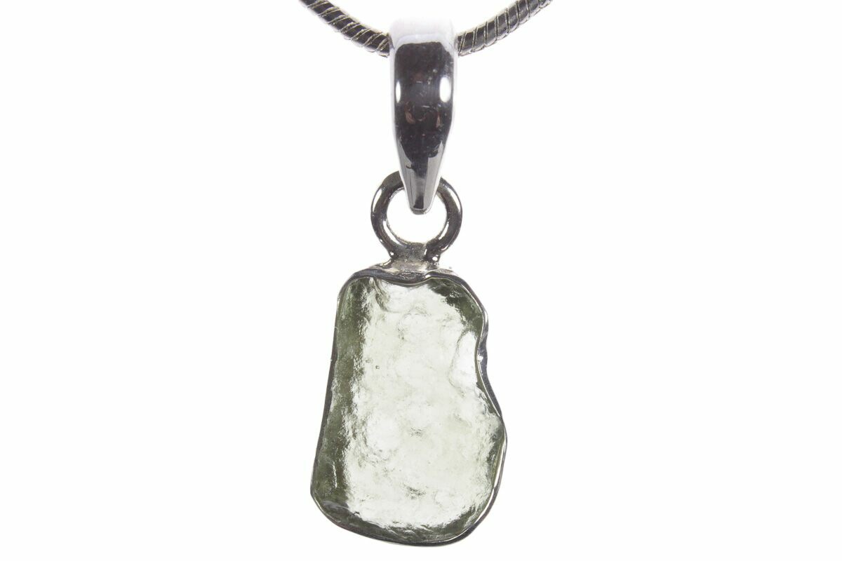 This is an authentic moldavite tektite specimen that was collected in the Czech Republic. The moldavite is inlaid in a silver pendant setting that allows you to take your favorite impactite on the go. When holding a light behind the pendant, the beautiful green coloration and translucency becomes apparent.