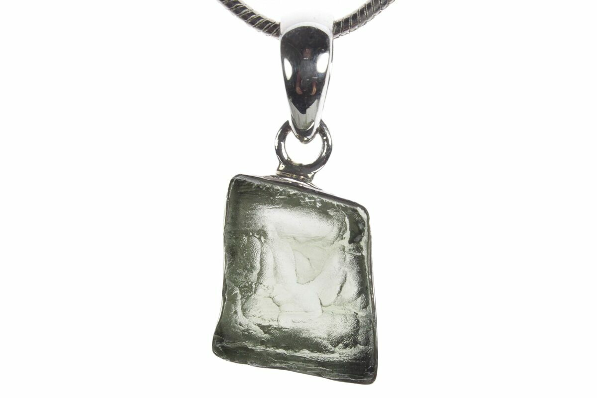 This is an authentic moldavite tektite specimen that was collected in the Czech Republic. The moldavite is inlaid in a silver pendant setting that allows you to take your favorite impactite on the go. When holding a light behind the pendant, the beautiful green coloration and translucency becomes apparent.