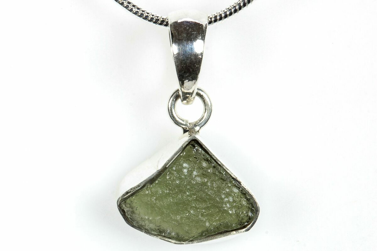 This is an authentic moldavite tektite specimen that was collected in the Czech Republic. The moldavite is inlaid in a silver pendant setting that allows you to take your favorite impactite on the go. When holding a light behind the pendant, the beautiful green coloration and translucency becomes apparent.