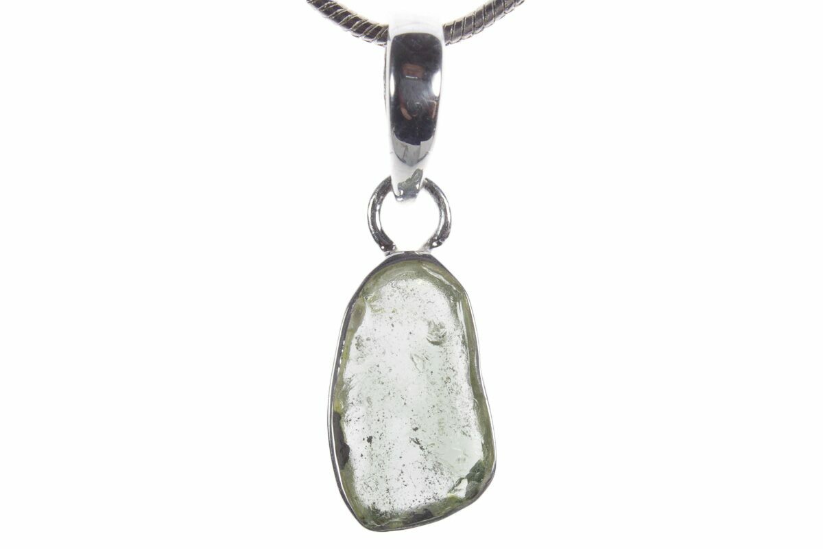 This is an authentic moldavite tektite specimen that was collected in the Czech Republic. The moldavite is inlaid in a silver pendant setting that allows you to take your favorite impactite on the go. When holding a light behind the pendant, the beautiful green coloration and translucency becomes apparent.