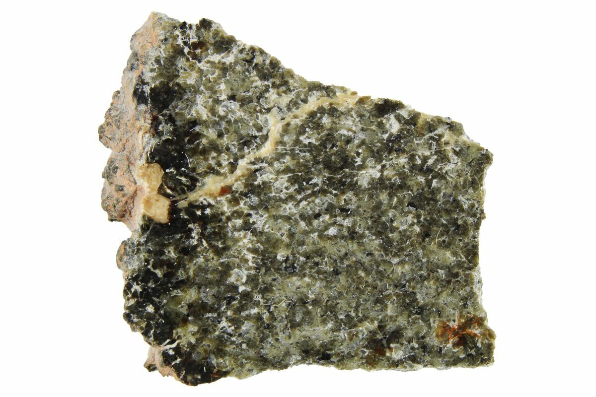 This is a .6" wide (0.84 grams) slice of the martian meteorite NWA (14714). It has been nicely cut into a thin slice and polished to a glossy finish on one side. It even displays some iridescence in translucent pockets throughout which can be seen in the photo above.