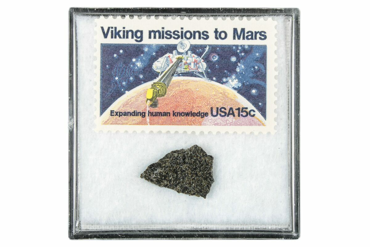 This is a .64" wide (.52 grams) martian meteorite slice from the NWA 16450 fall. This meteorite comes in a custom acrylic case which includes a 1978 Viking Mission to Mars stamp. This 15-cent multicolored commemorative stamp depicts the Viking 1 lander, the landing component, collecting a soil sample on Mars.