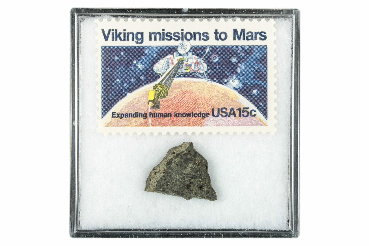 This is a .64" wide (.77 grams) martian meteorite slice from the Amgala 001 fall. This meteorite comes in a custom acrylic case which includes a 1978 Viking Mission to Mars stamp. This 15-cent multicolored commemorative stamp depicts the Viking 1 lander, the landing component, collecting a soil sample on Mars.