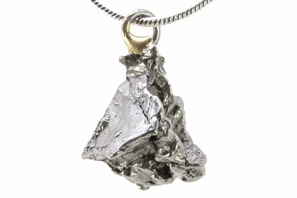 This is an authentic, .7" wide piece of an iron meteorite from the Campo del Cielo fall in Argentina. A metal loop has been attached to the meteorite so your favorite space rock can be displayed around your neck.