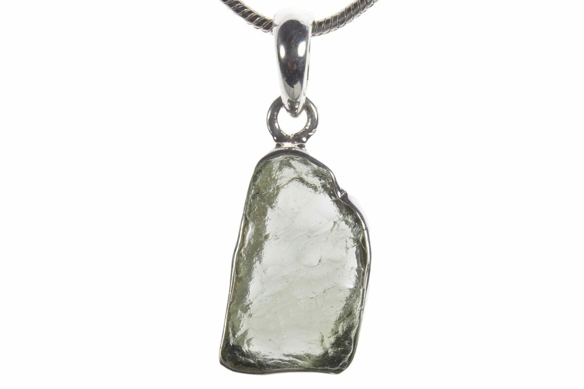 This is an authentic moldavite tektite specimen that was collected in the Czech Republic. The moldavite is inlaid in a silver pendant setting that allows you to take your favorite impactite on the go. When holding a light behind the pendant, the beautiful green coloration and translucency becomes apparent.