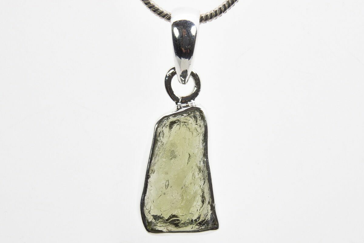 This is an authentic moldavite tektite specimen that was collected in the Czech Republic. The moldavite is inlaid in a silver pendant setting that allows you to take your favorite impactite on the go. When holding a light behind the pendant, the beautiful green coloration and translucency becomes apparent.