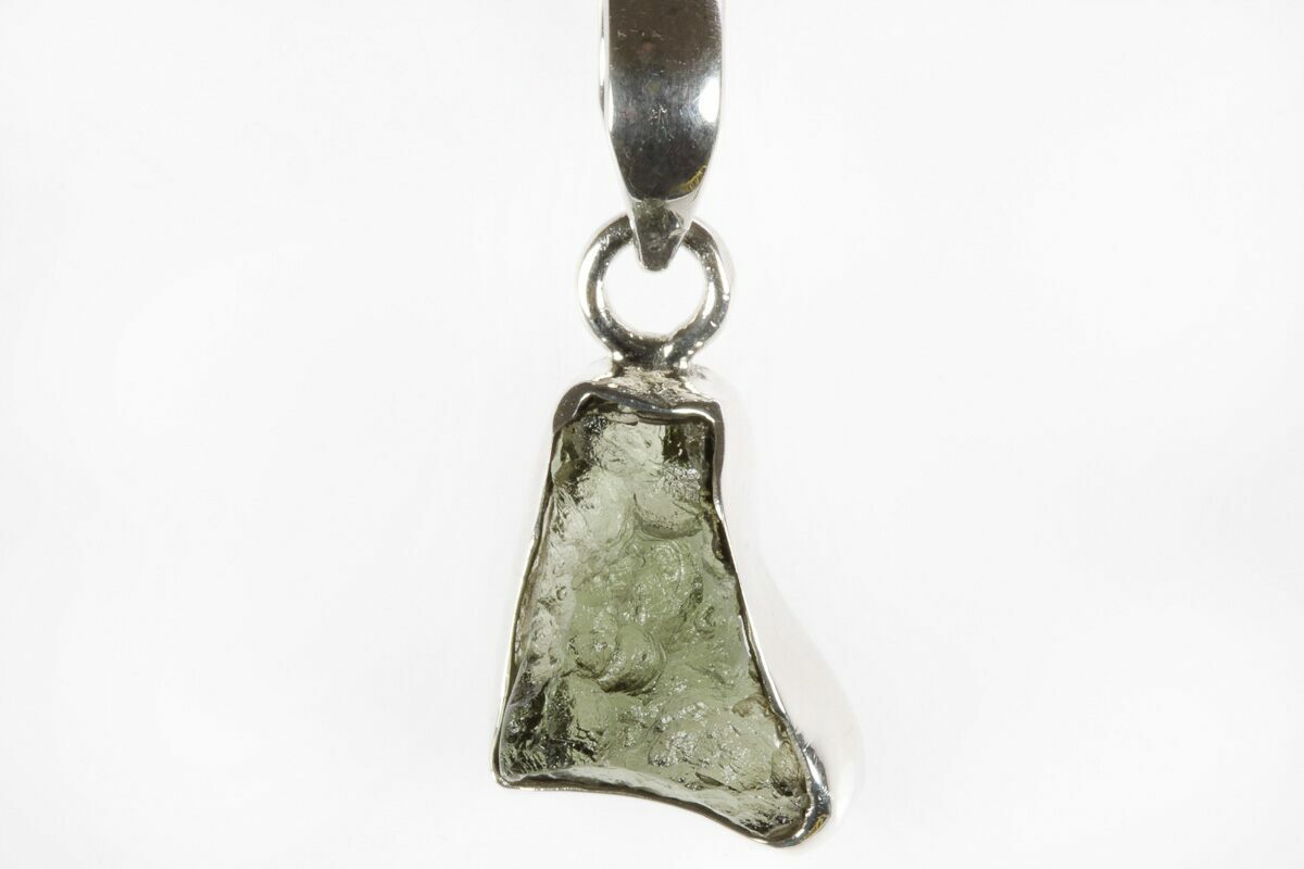 This is an authentic moldavite tektite specimen that was collected in the Czech Republic. The moldavite is inlaid in a silver pendant setting that allows you to take your favorite impactite on the go. When holding a light behind the pendant, the beautiful green coloration and translucency becomes apparent.