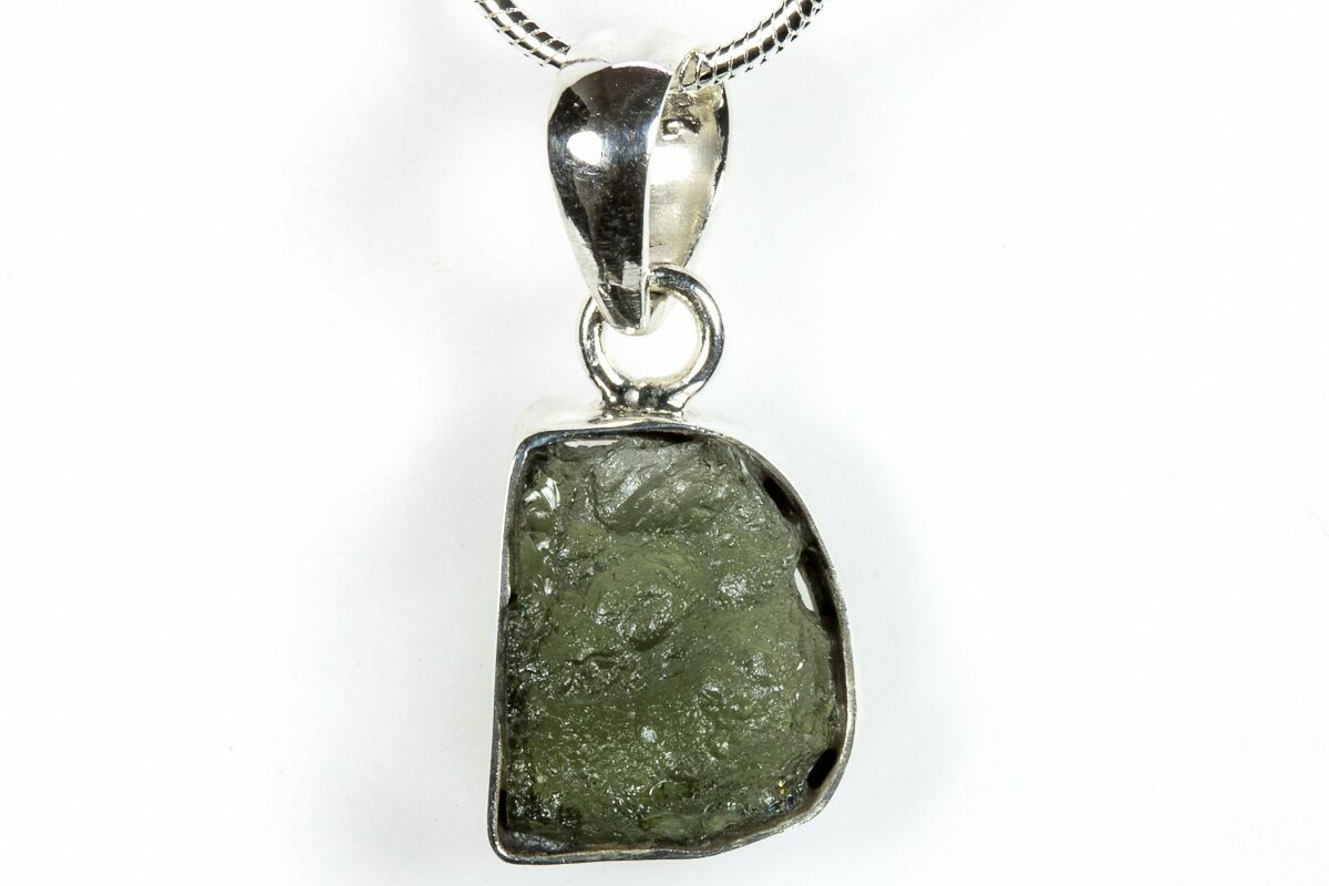This is an authentic moldavite tektite specimen that was collected in the Czech Republic. The moldavite is inlaid in a silver pendant setting that allows you to take your favorite impactite on the go. When holding a light behind the pendant, the beautiful green coloration and translucency becomes apparent.