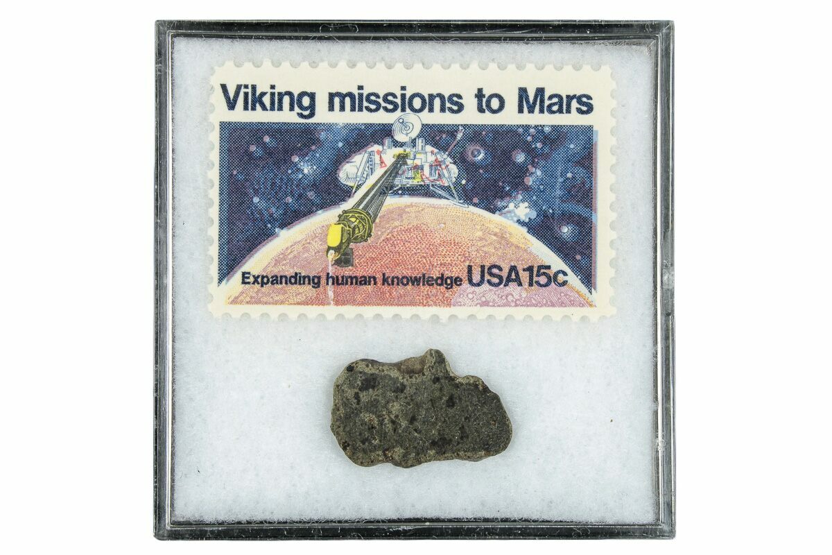 This is a .70" wide (.68 grams) martian meteorite slice from the Amgala 001 fall. This meteorite comes in a custom acrylic case which includes a 1978 Viking Mission to Mars stamp. This 15-cent multicolored commemorative stamp depicts the Viking 1 lander, the landing component, collecting a soil sample on Mars.