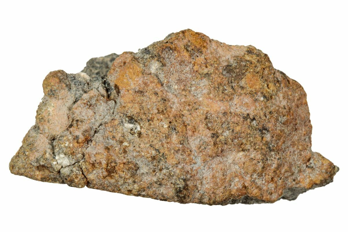 Bechar 008 is a polymict breccia characterized by lithic clasts of pyroxene-rich, eucritic gabbros and granulites. These gorgeous, multicolored clasts are suspended in a fine-grained matrix colored a darker brown-gray.