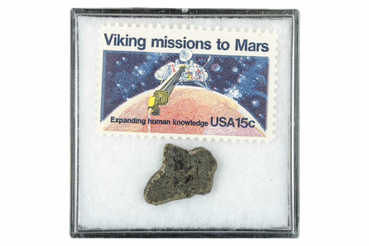 This is a .71" wide (.70 grams) martian meteorite slice from the Amgala 001 fall. This meteorite comes in a custom acrylic case which includes a 1978 Viking Mission to Mars stamp. This 15-cent multicolored commemorative stamp depicts the Viking 1 lander, the landing component, collecting a soil sample on Mars.