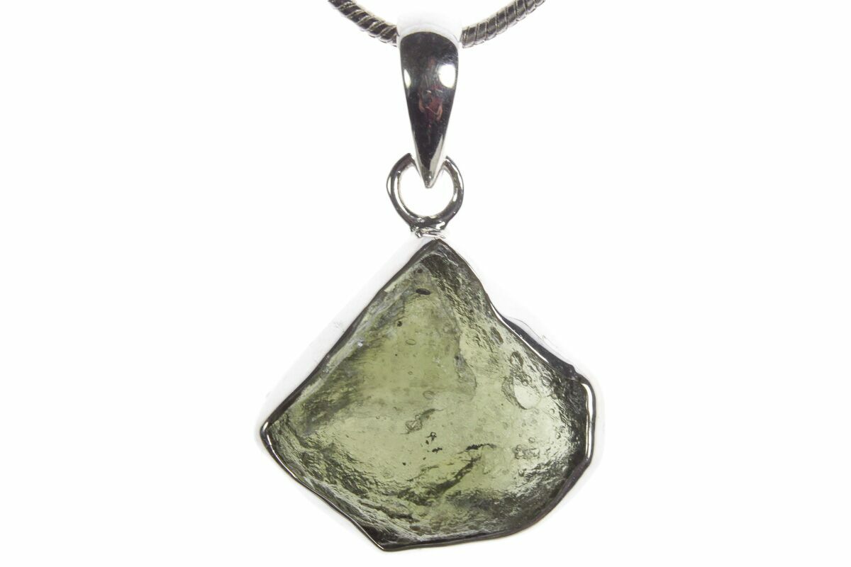 This is an authentic moldavite tektite specimen that was collected in the Czech Republic. The moldavite is inlaid in a silver pendant setting that allows you to take your favorite impactite on the go. When holding a light behind the pendant, the beautiful green coloration and translucency becomes apparent.