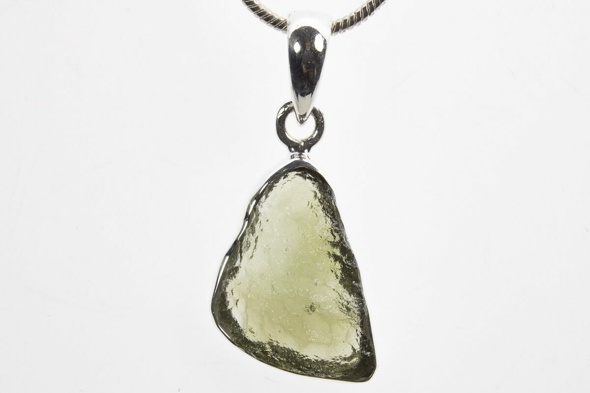 This is an authentic moldavite tektite specimen that was collected in the Czech Republic. The moldavite is inlaid in a silver pendant setting that allows you to take your favorite impactite on the go. When holding a light behind the pendant, the beautiful green coloration and translucency becomes apparent.