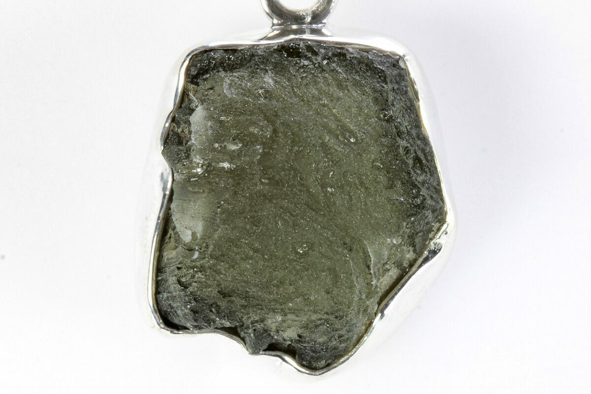 This is an authentic moldavite tektite specimen that was collected in the Czech Republic. The moldavite is inlaid in a silver pendant setting that allows you to take your favorite impactite on the go. When holding a light behind the pendant, the beautiful green coloration and translucency becomes apparent.
