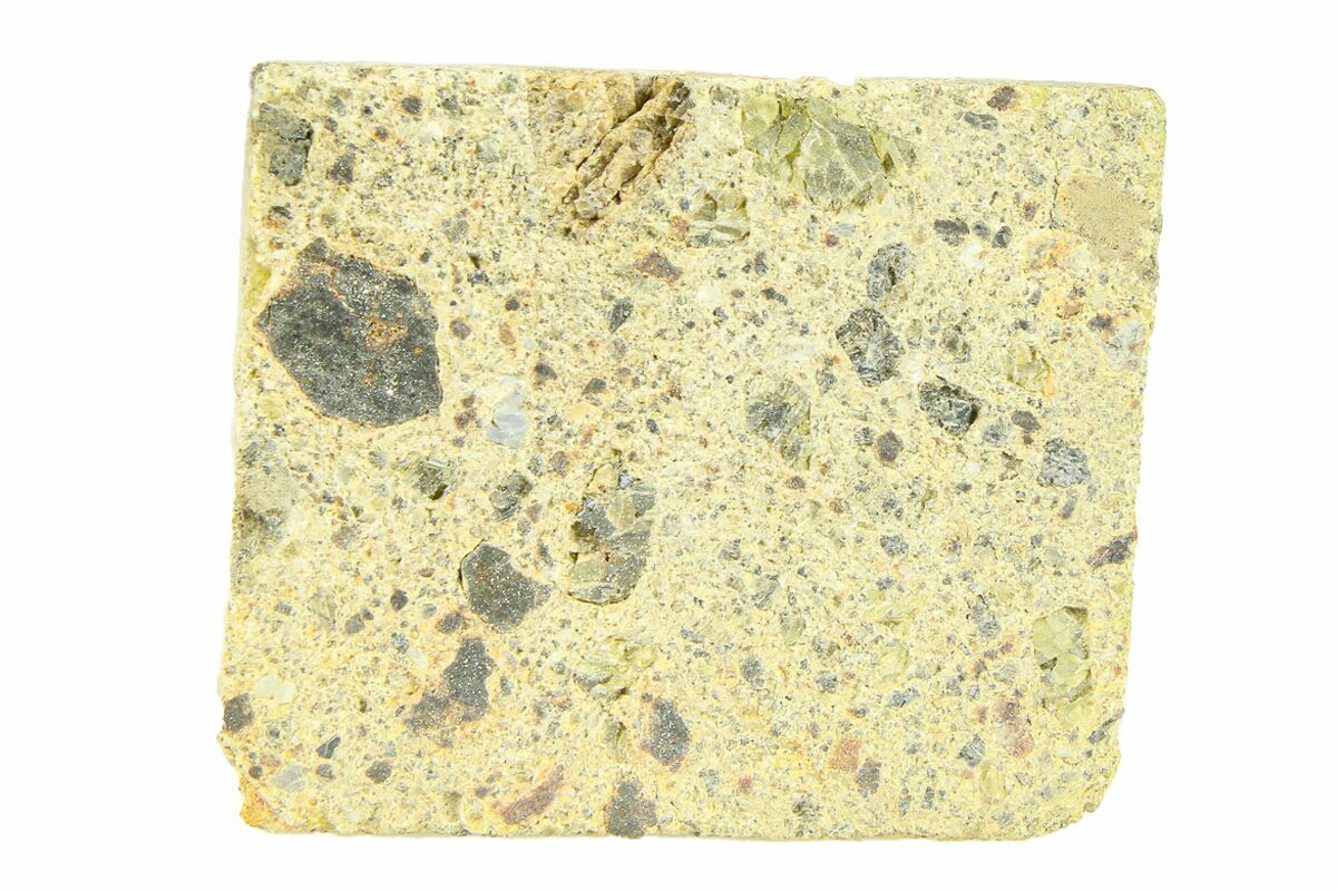 This is a .81" wide, 5.29-gram slice of the diogenite meteorite known as NWA 15339. It displays handsome diogenitic orthopyroxene clasts.