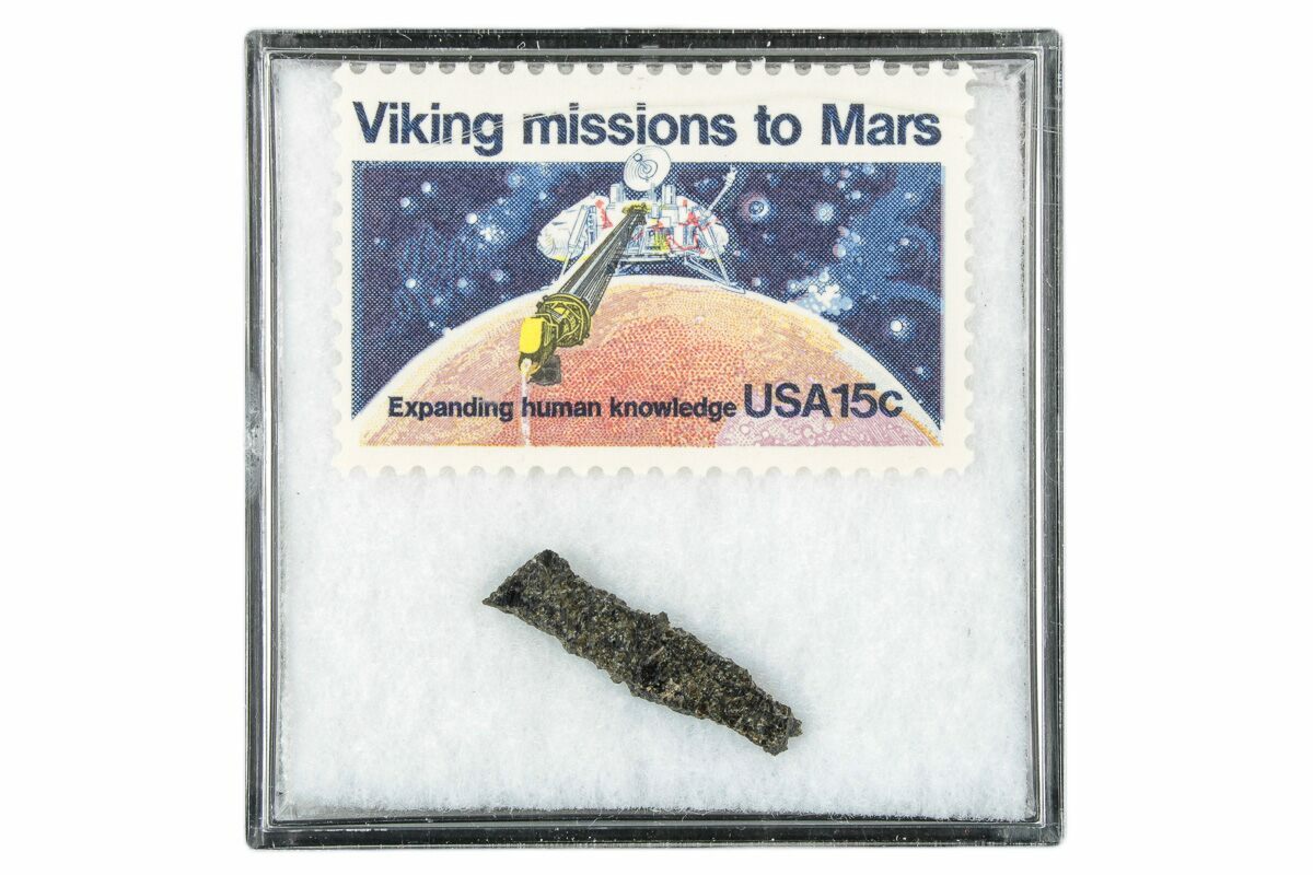 This is a .83" wide (.42 grams) martian meteorite slice from the NWA 16450 fall. This meteorite comes in a custom acrylic case which includes a 1978 Viking Mission to Mars stamp. This 15-cent multicolored commemorative stamp depicts the Viking 1 lander, the landing component, collecting a soil sample on Mars.