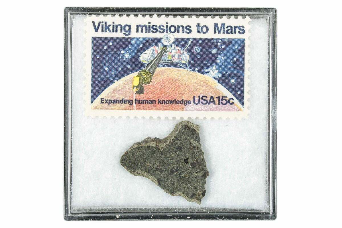 This is a .84" wide (1.30 grams) martian meteorite slice from the Amgala 001 fall. This meteorite comes in a custom acrylic case which includes a 1978 Viking Mission to Mars stamp. This 15-cent multicolored commemorative stamp depicts the Viking 1 lander, the landing component, collecting a soil sample on Mars.