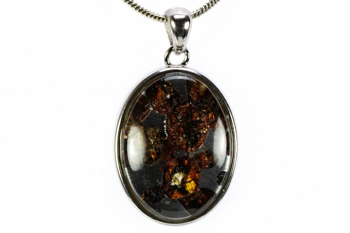 This is a .86" tall oval Seymchan pallasite meteorite pendant in a 925 silver frame. It comes from the Magadan district of Russia. The thin slicing of the pallasite beautifully highlights the olivine (forsterite) crystals' translucency when backlit. The slice of Seymchan pallasite has been coated in a clear epoxy to stabilize it. It is accompanied by a 24" silver plated snake chain with a lobster clasp.