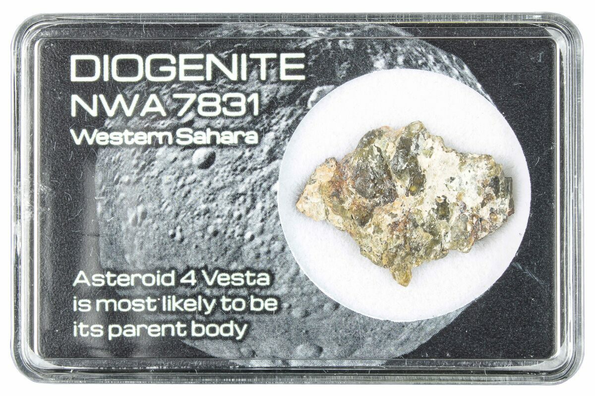 This is a .87" wide (2.1 gram) fragment of the Diogenite meteorite NWA 7831 in an acrylic display case. It has beautiful, gemmy, green orthopyroxene crystals that have a bright sheen on their cleaved faces. A really beautiful and interesting meteorite!