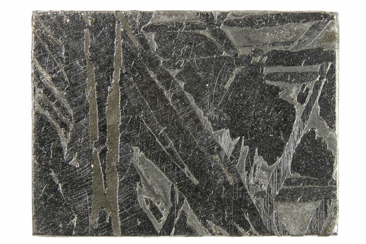 Most iron meteorites have distinctive, geometric patterns called Widmanstätten patterns, which become visible when the meteorite is cut and acid etched. These patterns are criss-crossing bands of the iron-nickel alloys kamacite and taenite that slowly crystalized as the core of the meteorites' parent bodies slowly cooled. Such large alloy crystallizations for mover millions of years and do not occur naturally on Earth, further proving that iron meteorites come from extraterrestrial bodies.