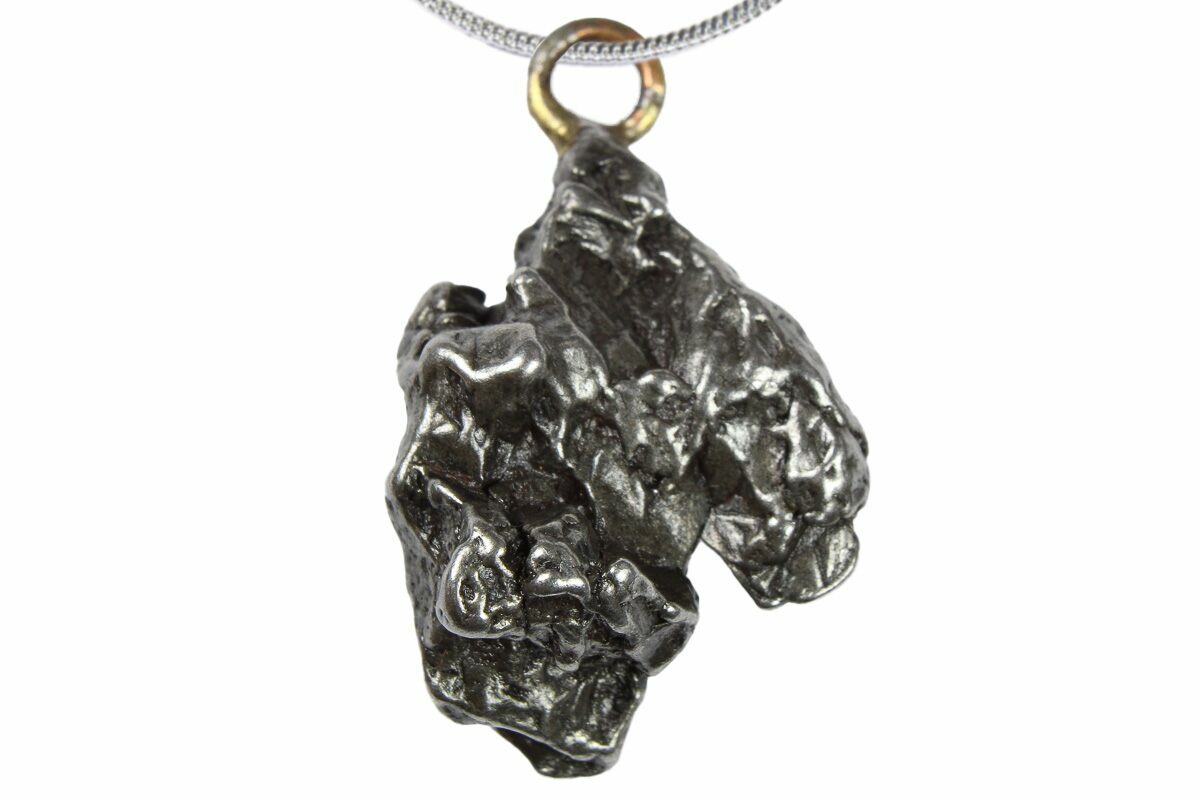 This is an authentic, .9" wide piece of an iron meteorite from the Campo del Cielo fall in Argentina. A metal loop has been attached to the meteorite so your favorite space rock can be displayed around your neck.