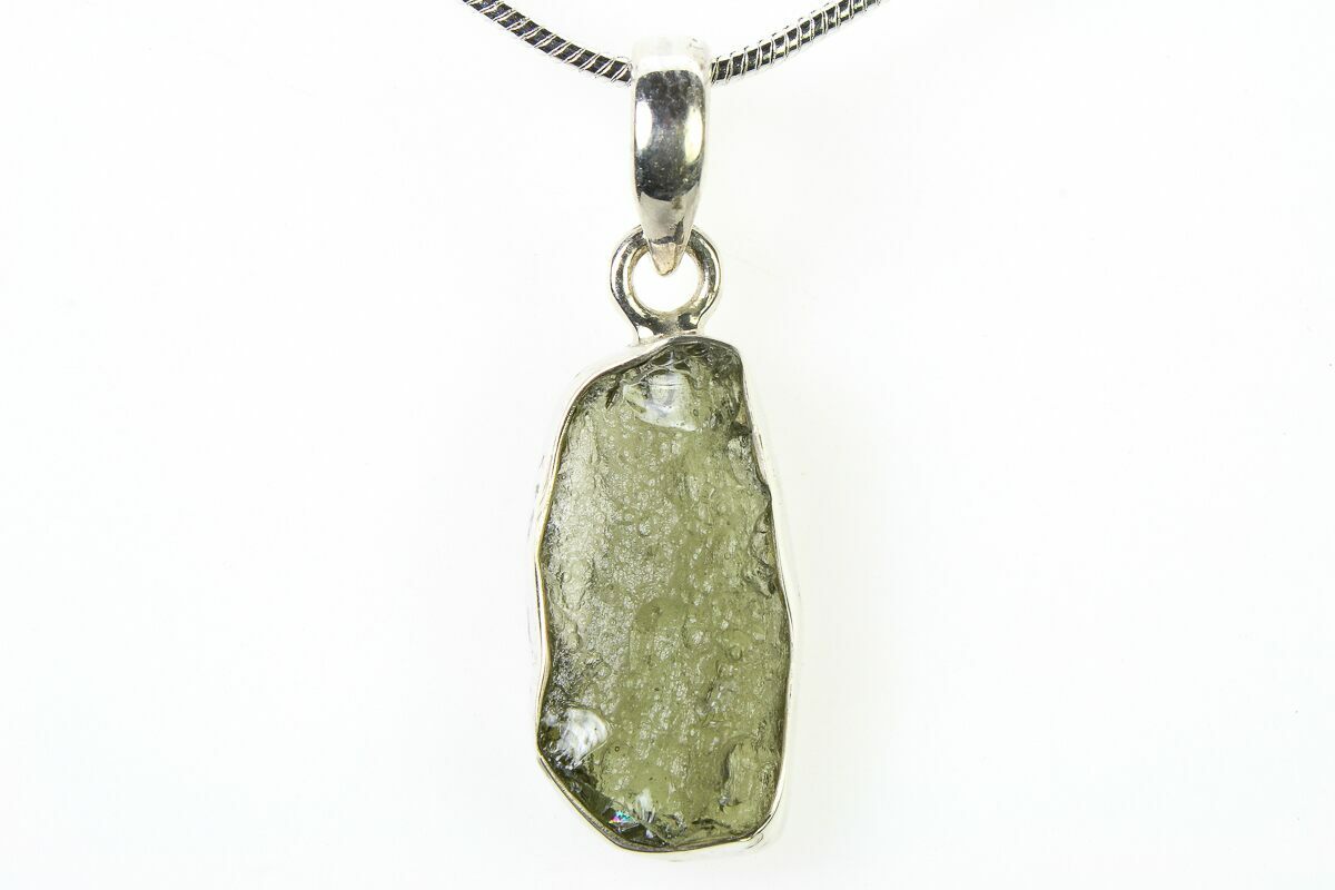 This is an authentic moldavite tektite specimen that was collected in the Czech Republic. The moldavite is inlaid in a silver pendant setting that allows you to take your favorite impactite on the go. When holding a light behind the pendant, the beautiful green coloration and translucency becomes apparent.