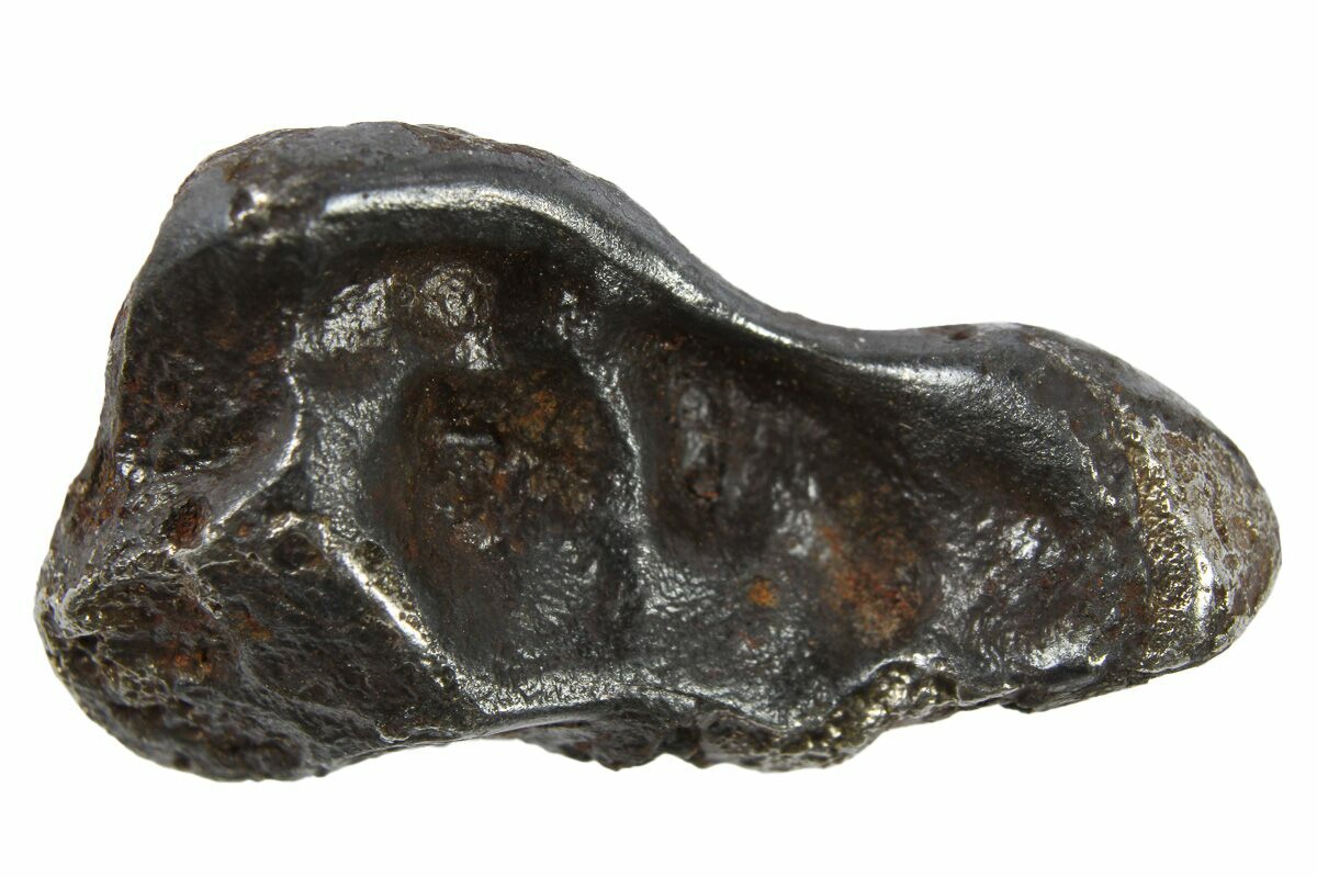 This is a .75" wide (4.3 grams) oriented piece of the iron-nickel (coarse octahedrite) Sikhote-Alin meteor, collected from the strewn field in the Sikhote-Alin Mountains of Russia. This meteorite has signature thumbprint-like dimples on its surface called regmaglypts, a feature only found on meteorites!