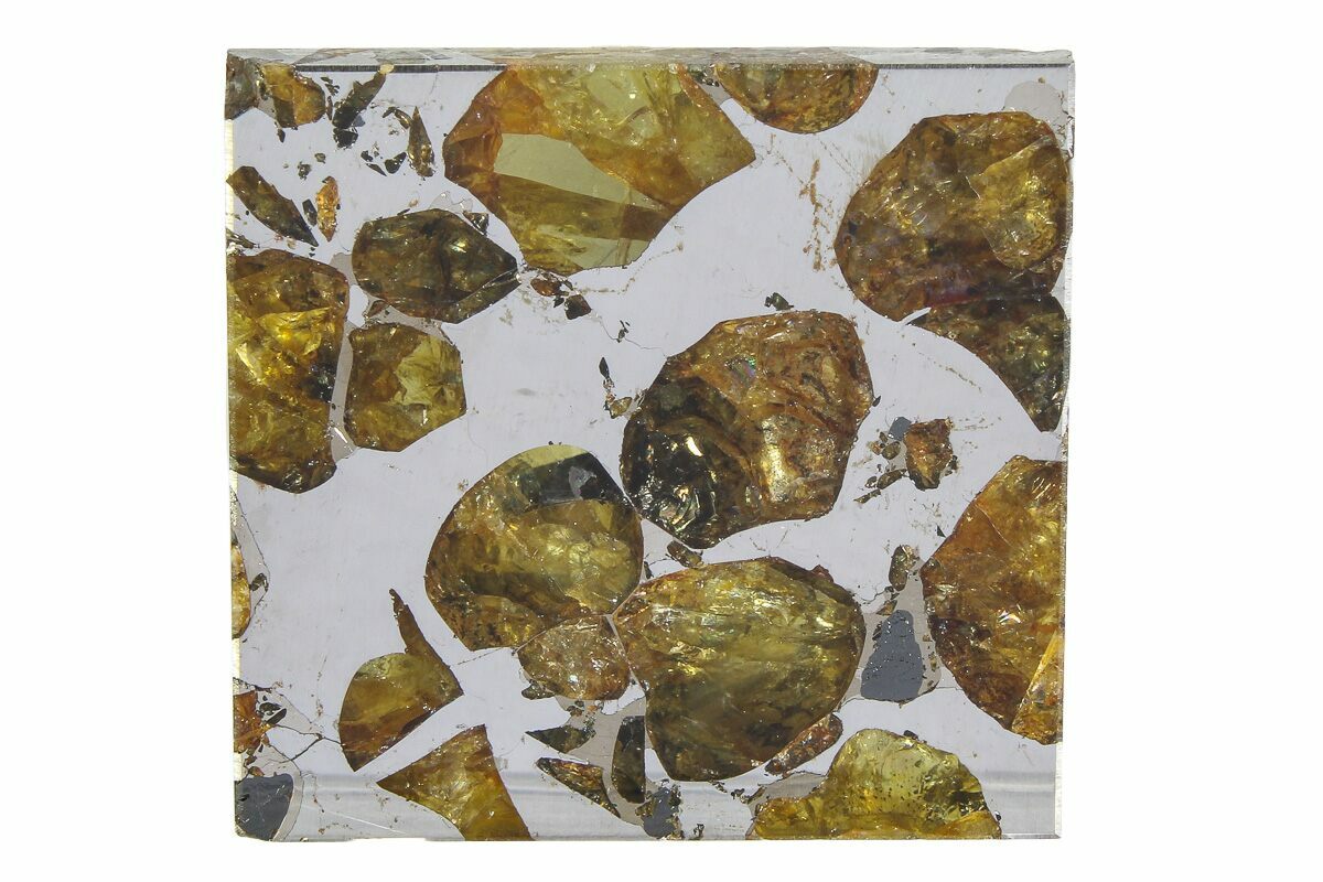 This .90 wide (6.41 gram) slice of the beautiful Brahin pallasite meteorite. It mostly is one big olivine crystal and a little bit of the nickel-iron matrix.